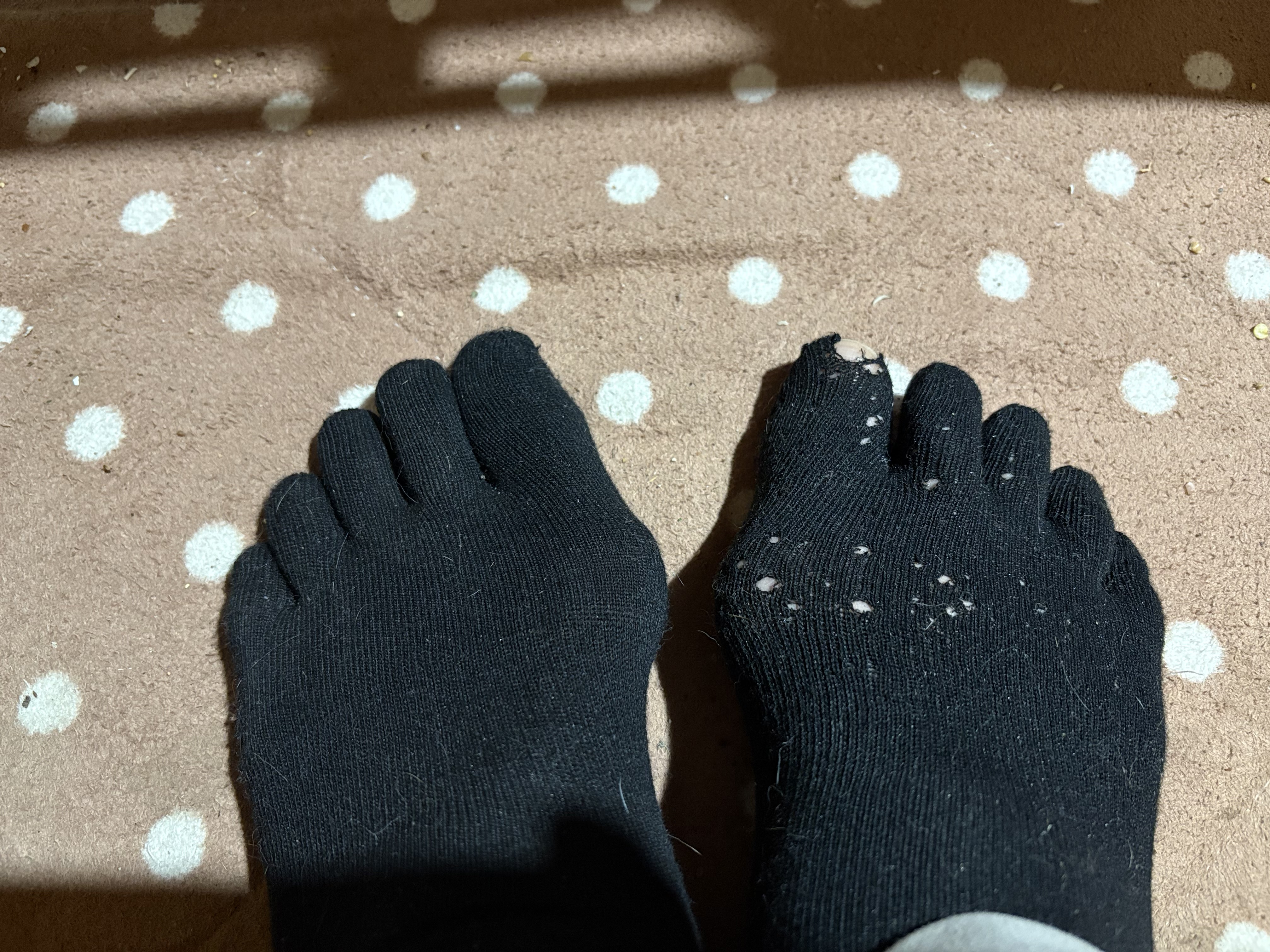 ダイソー安芸店にて、5本指ソックスをまとめ買い。200円商品ですが、ソックスは激しい消耗品なので、破れるのを前提にしています。5足中1足が、最初から穴だらけの不良品。まあ、想定内ですが、しっかりブログしておきます。