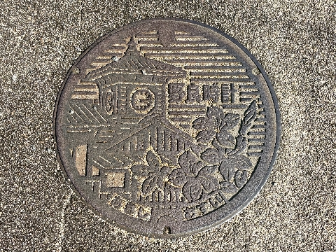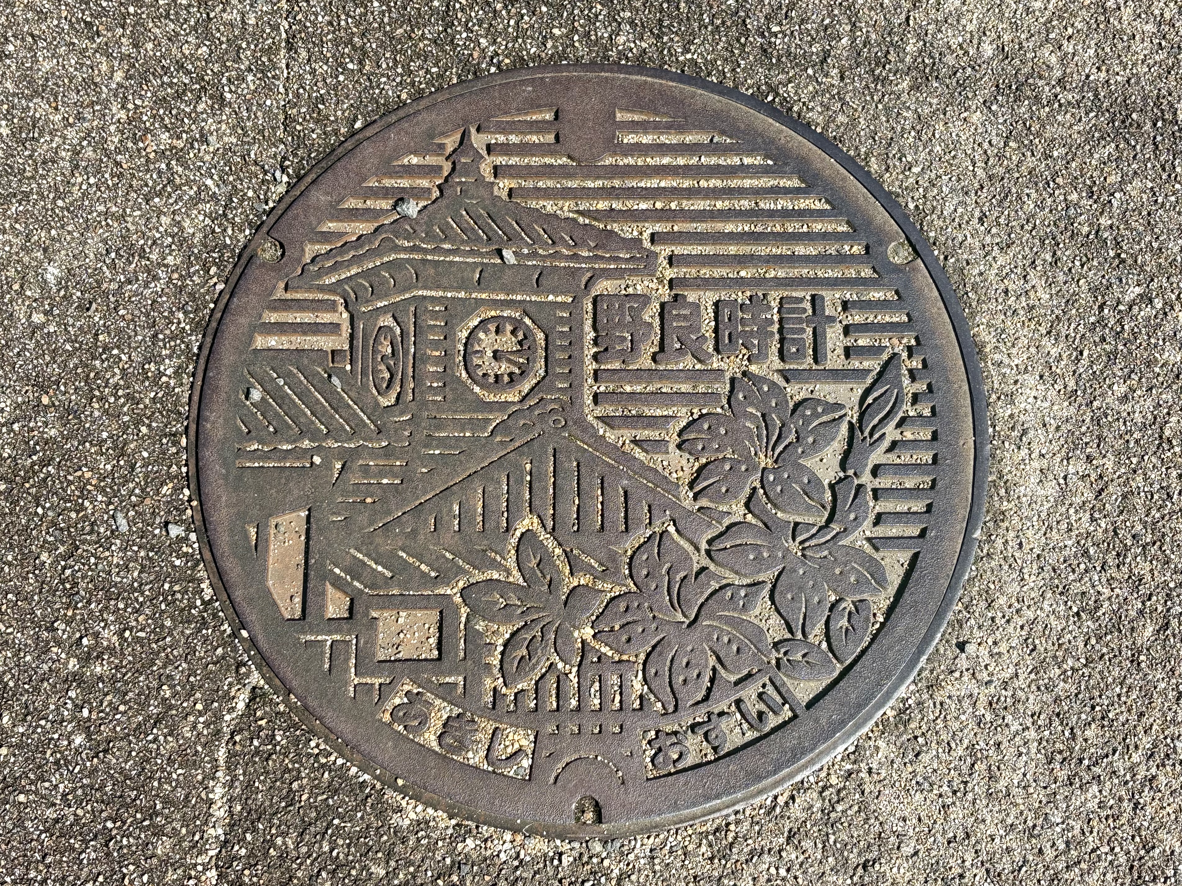 小道の両側の『小石』は、当時のまま残したものだそうです。マンホールの蓋は、野良時計ですね。
