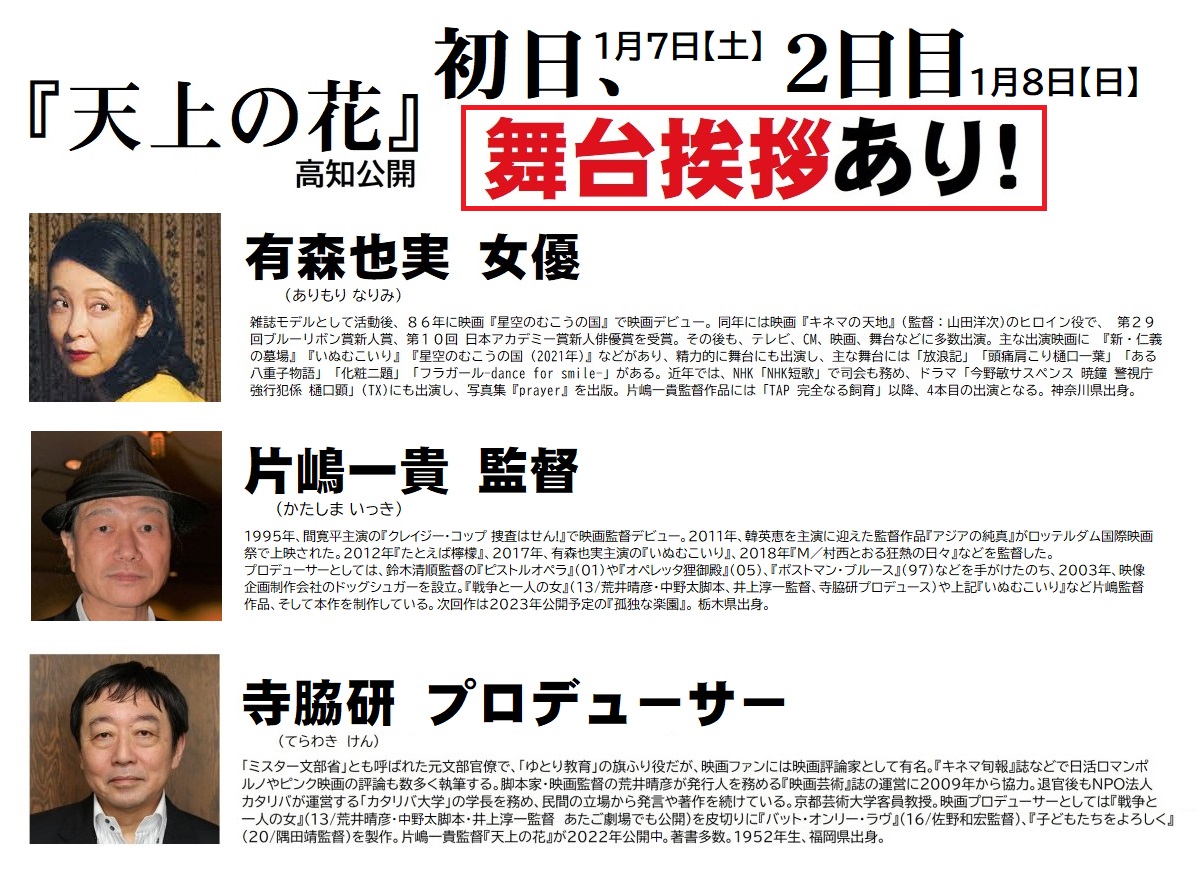『天上の花』高知公開記念舞台挨拶あり! [上映作品] 初日、2日目に出演の有森也実さん、片嶋一貴監督、寺脇研プロデューサーの舞台挨拶があります!