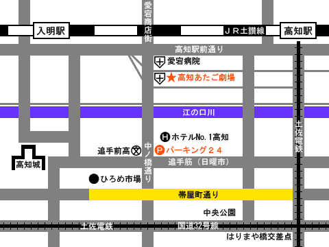 JR[高知駅]および土佐電鉄[高知駅前駅]より、徒歩約8分。