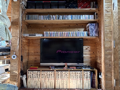 テレビ上の棚の高さを変えて、テレビをスッキリ奥まで移動。居間が10cm広くなりました。
