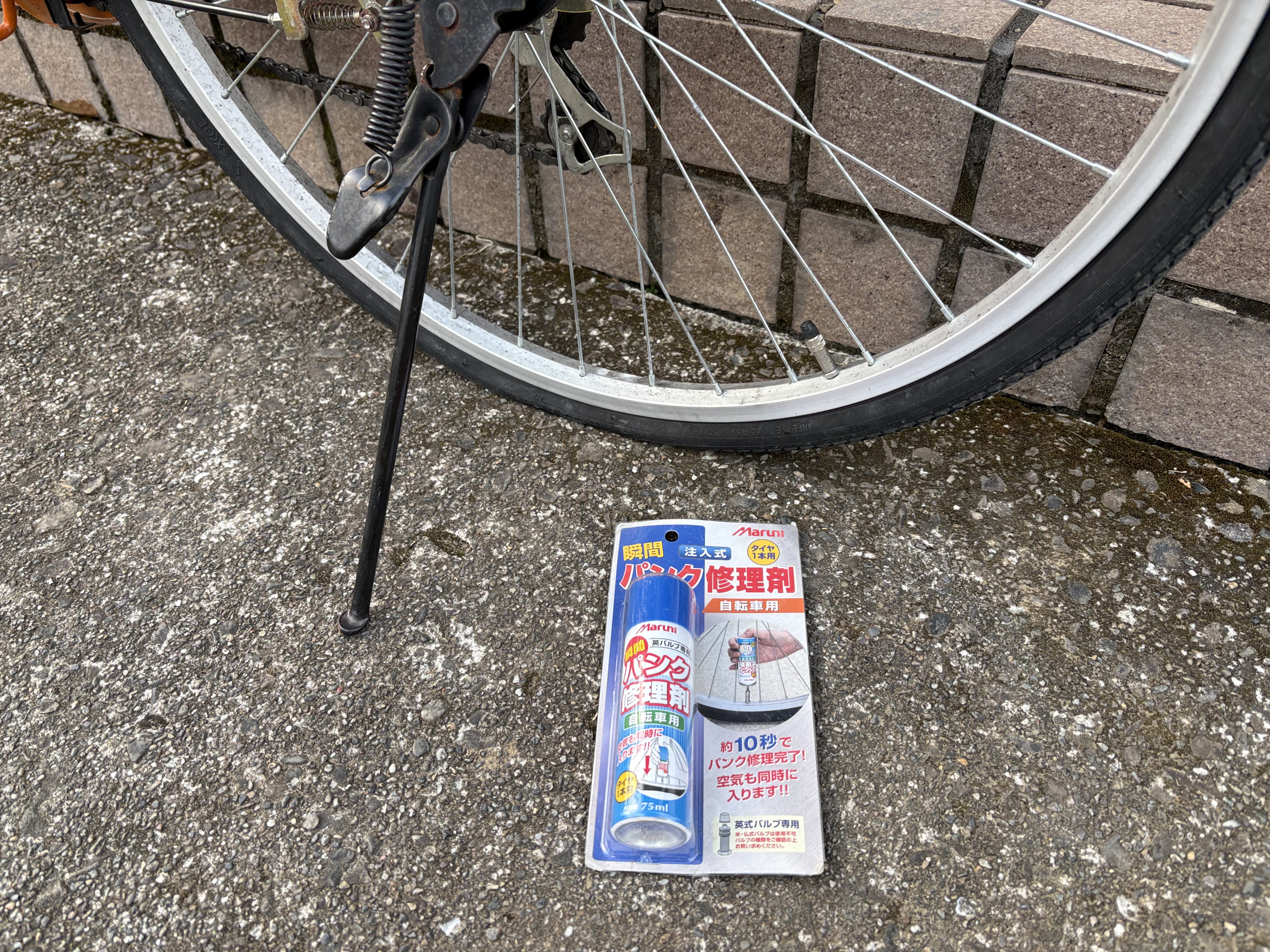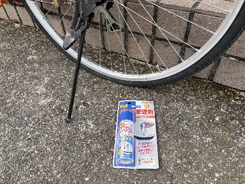 パンクした気配は無かったのですが、あらかじめ買っておいた『瞬間パンク修理剤』を注入してみました。一度、試しておきたかったんです。
