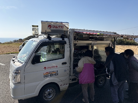 今日から平集会所に回ってもらえるようになりました。初日の呼びかけもあり、大勢の方々がお買い物に来られて、皆んな喜んでおられました。