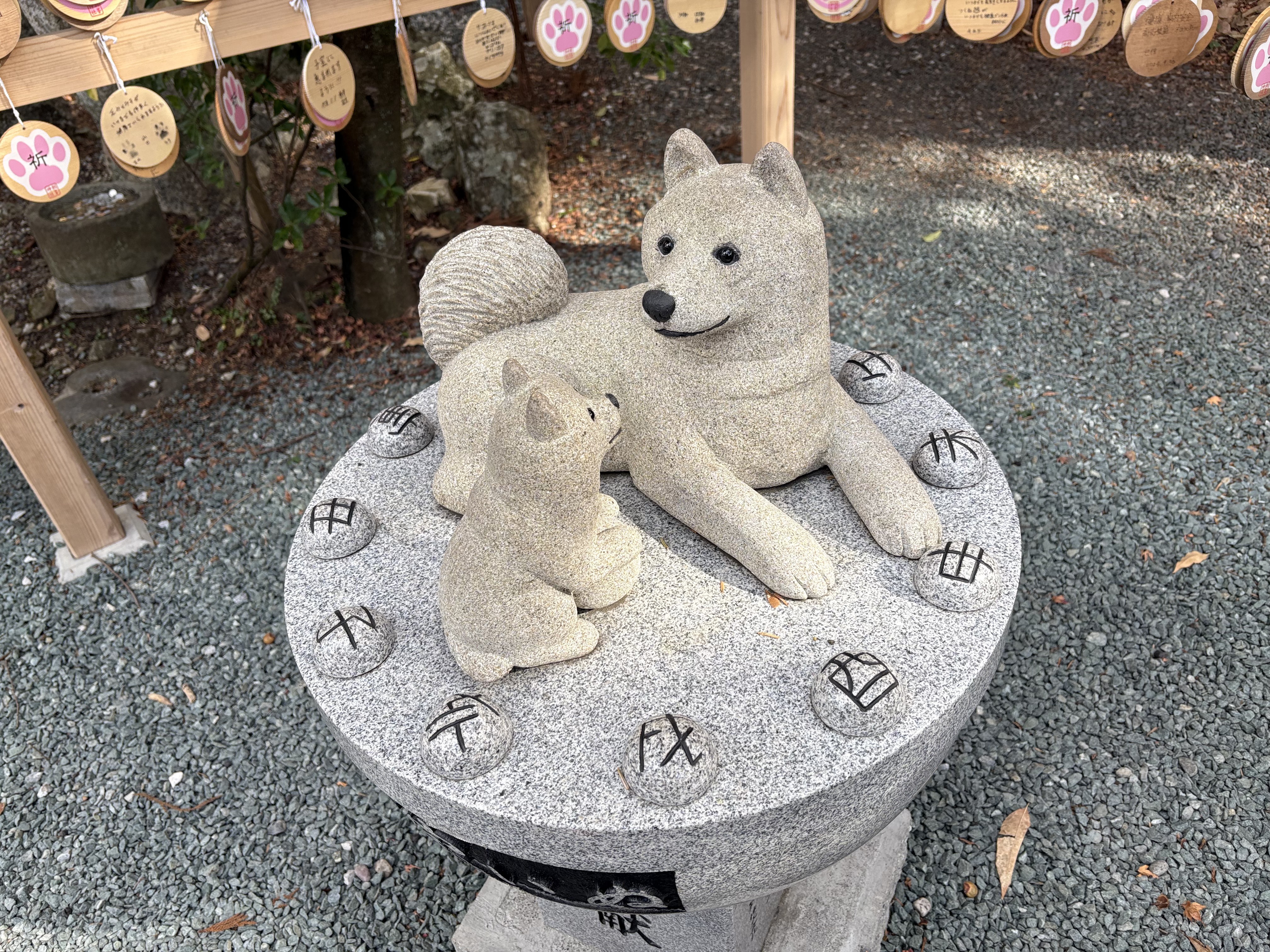 境内の狛犬?が愛らしい。コンクリート道には、犬の足跡もあり、楽しいね🐶🐾