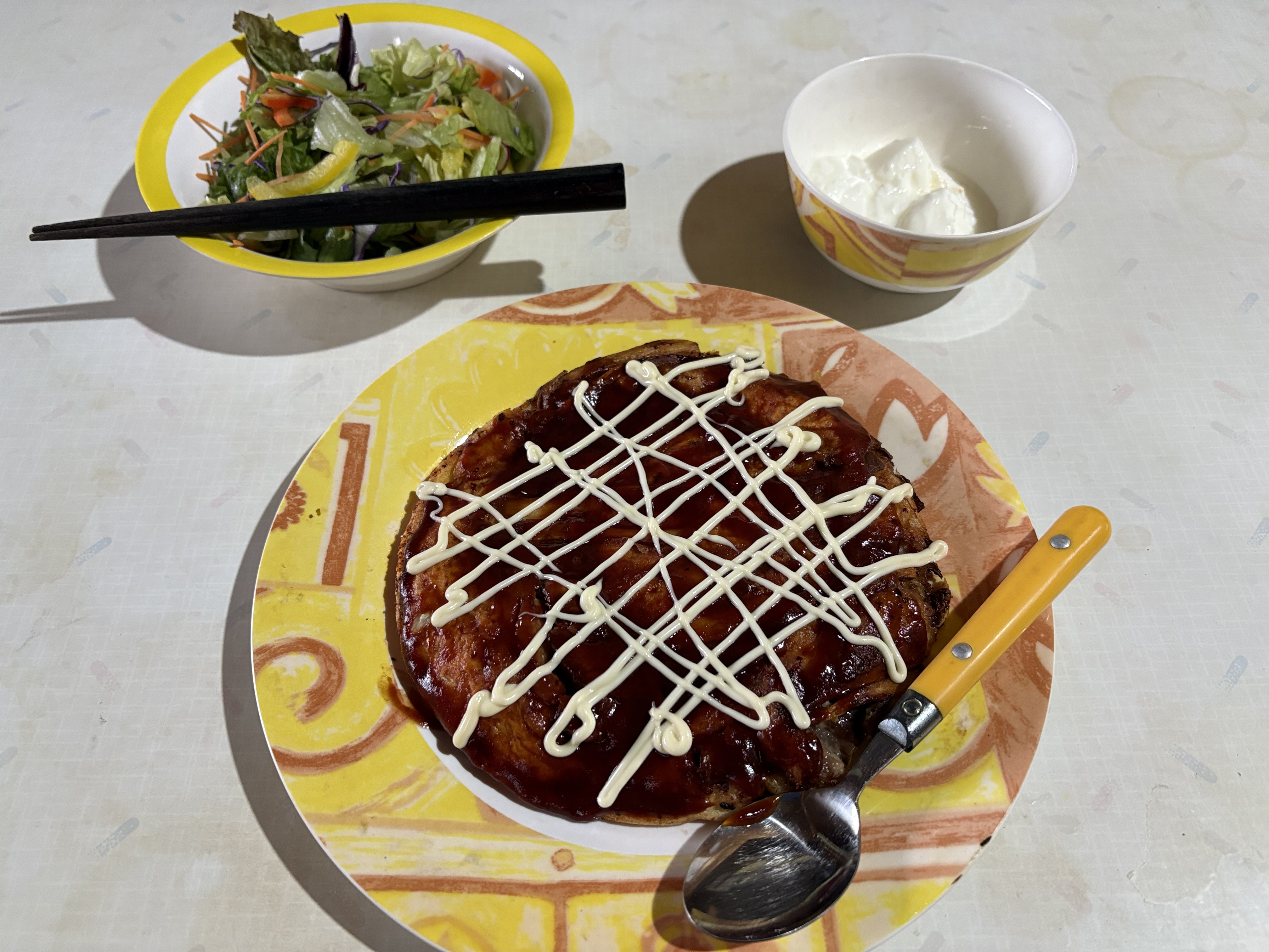 キャベツを使い切るため、お好み焼き。昨晩の残りのエリンギで豚玉に。
