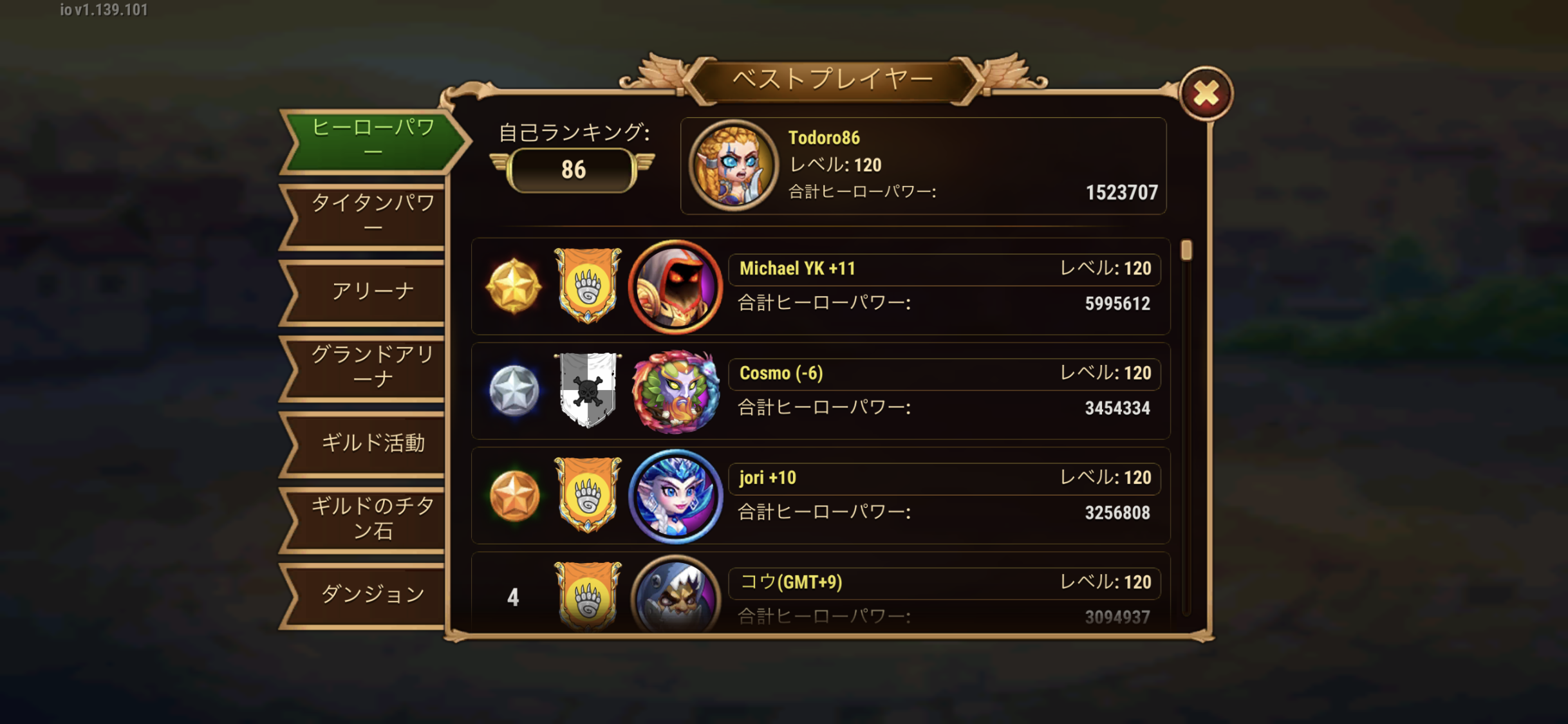 個人のヒーローパワーが75位まで順調に登りつめた時点で、別のサーバからハイレベルの大量移民が押し寄せて、かなり降格してましたが、ようやく86位まで回復しました。