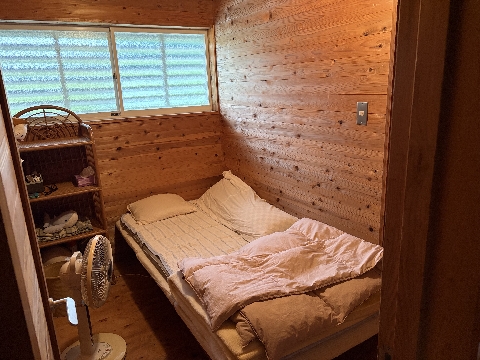 なお、ベッドは、贅沢にも一枚板のテーブルを流用🛌 高さといい、安定感といい、最高の使い心地です🙂↔️